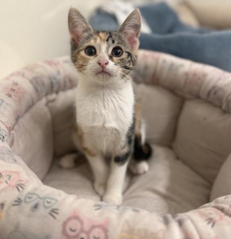 Aren’t I a beautiful little calico girl? My foster family (both cats and humans) have helped me warm up and come out of my shell. I do love tussling with my kitty friends so I will need a kitty friend. I love food and will be the first one in line. My foster family says I am a sweetheart but I do love my personal space. Do you have space in your home and heart for me?