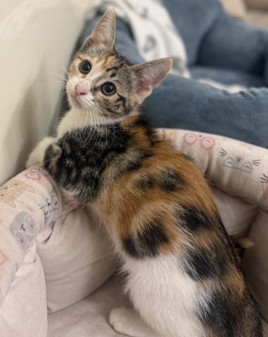 Aren’t I a beautiful little calico girl? My foster family (both cats and humans) have helped me warm up and come out of my shell. I do love tussling with my kitty friends so I will need a kitty friend. I love food and will be the first one in line. My foster family says I am a sweetheart but I do love my personal space. Do you have space in your home and heart for me?